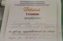 Сегодня на Республиканской гуманитарной научно-практической конференции "Глобализация-реальность современного мира" ученик 5 б класса Алетдинов Ансар был награжден дипломом I степени. Наши поздравления! Желаем Ансару новых побед!