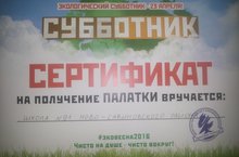 Наша школа по результатам Экологического конкурса"Субботник 2016" получила сертификат на получение палатки. Спасибо всем участникам субботника!!! Молодцы!!!