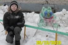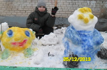 Кузьмин Илья ученик 3 Б класса около школы построил из снега и раскрасил героев мультфильма "Смешарики"