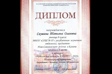 Администрация школы поздравляет призёров конкурса исследовательских работ «Нобелевские надежды КНИТУ – 2013» в номинации «Социология» Саушину Татьяну (8б класс, 3 место) и Худякову Ангелину (10б класс, 2 место). Миндубаеву Исламию (6А класс) и Фазуллину Лию (5 класс), ставших победителями в городской олимпиаде "Всезнайка» по предмету татарский язык; а также Хасаншина Булата (5В класс) и Зуеву Лилию (8В класс), которые приняли активное участие в олимпиаде «Всезнайка» по предметам математика и химия соответственно