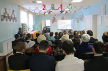 Учитель с помощью мультимедийного пректора рассказал про поисковую работу Валиуллина Тахира Анваровича, выпускник нашей школы, член поискового отряда "Нефтехимик".
