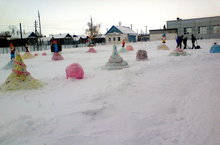 В этом году долго ждали снега. а пока ждали, "Лепили" фигурки не из снега, а из ДВП. Сначала рисовали, потом вырезали, и, наконец, разукрашивали. Композиция была взята из сказки "Белоснежка и семь гномов". В создании сказочного городка участвовали как старшие классы, так и младшие. Когда дождались снега, дети стали лепить новогодние шары, елочки, снеговиков.