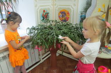 Воспитатель Мельникова М.Н. учит детей, оказывать посильную помощь воспитателю в уходе за комнатными растениями:протирать листья влажной тряпочкой, проявляя при этом осторожность. Такой способ ухода за растениями, облегчает дыхание растений, от чего зависит их рост и развитие. Воспитатель развивает трудовые умения и навыки, аккуратность с водой и растениями.