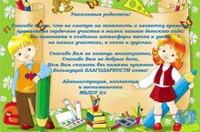 Сегодня знаменательный день, сегодня у наших деток первый в жизни, Первый звонок! Скоро они сменят свои игрушки на книжки, тетради, ручки и линейки. Очень грустно расставаться с беззаботным детством. В детском саду, вложили в вас свою любовь, научили петь, плясать, рассказывать стихи, дружить и проявлять характер. Хотим пожелать детишкам не забывать, чему вас научили в детском саду, желаем учиться на «отлично и хорошо», радовать родителей своими успехами