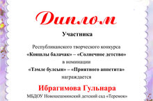 Диплом Республиканского творческого конкурса "Кояшлы балачак" 12.12.2016 Диплом Республиканского творческого конкурса "Кояшлы балачак"-"Солнечное детство", в номинации "Тэмлэ булсын"-"Приятногго аппетита", организованного редакцией журнала "Тылсымлы куллар", издателство "Ихлас",при Министерстве культуры РТ, награждена воспитанница Новошешминского детского сада "Теремок", Ибрагимова Гульнара Ильнаровна. Мы поздравляем Гульнару и ее родителей, и желаем им удачи.