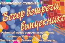 Районный вечер встречи выпускников состоится 30 января в 17.00 в РДК! Приглашаются выпускники школ, а также учащиеся 10 и 11 классов. -