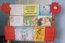 Сегодня школьный библиотекарь Козлова Л.А. оформила обзорную выставку ко дню матери "Сердце матери - исток доброты"