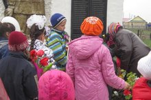 После поздравительных речей все участники торжественного митинга посвящённого празднованию 70-летия Великой Победы, возложили венки и цветеы к обелиску павшим солдатам.