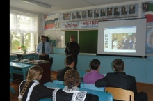 На первой фотографии Зайцев И.П. и директор школы Трошина Е.А. провлдят совместный урок.