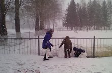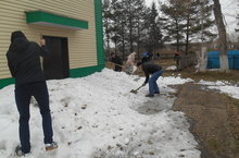 Учащиеся, учителя и сотрудники школы в очередной раз вышли на уборку территории. Они раскидали снег, собрали листву и другой мусор.