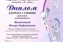 Преподаватель Маланчева В.Р.приняла участие в Международном конкурсе педагогического мастерства г.Москва и получила Диплом 1 степени затворческую публикацию "Борис Печерский - педагог, пианист, композитор". Поздравляем Венеру Рафкатовну и желаем творческих успехов!