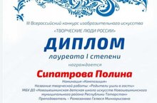 Ученица художественного отделения Сипатрова Полина приняла участие в III Всероссийском конкурсе изобразительного искусства "Творческие люди России", который проходил в г.Уфе 28-30 октября и получила Диплом Лауреата I степени в номинации "Композиция" за творческую работу "Родители ушли в гости". Поздравляем Полину и ее педагога Рамазанову Г.М. с победой и желаем им творческих успехов!