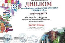 Ученица музыкального отделения по классу фортепиано Салихова Мадина приняла участие во Всероссийском конкурсе-фестивале творчества детей и взрослых "Тетюши Art-Fest" и получила Диплом Лауреата I степени в номинации "Фортепиано" возрастная категория 7-9 лет, педагог Маланчева В.Р. Педагогу Маланчевой В.Р. вручено Благодарственное письмо оргкомитета фестиваля.