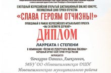 Приняв участие во Всероссийском конкурсе "Слава героям Отчизны" учащийся класса вокала Бочкарев Даниил стао Лауреатом I степени. Преподаватель Даниила Мазманян Л.Н. награждена Благодарственным письмом организаторами конкурса.