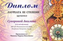 Ученица хореографического отделения 4 класса ФГТ Суворова Акилина приняла участие в Международной олимпиаде по слушанию музыки "Музыкальный калейдоскоп" и стала Лауреатом III степени. Педагого Минаева М.Н. Олимпиада проходила в Москве в международном центре поддержки творчества и таланта "ART Vietory". Поздравляем Акилину и ее педагога с замечательной победой! Желаем творческих успехов и побед"