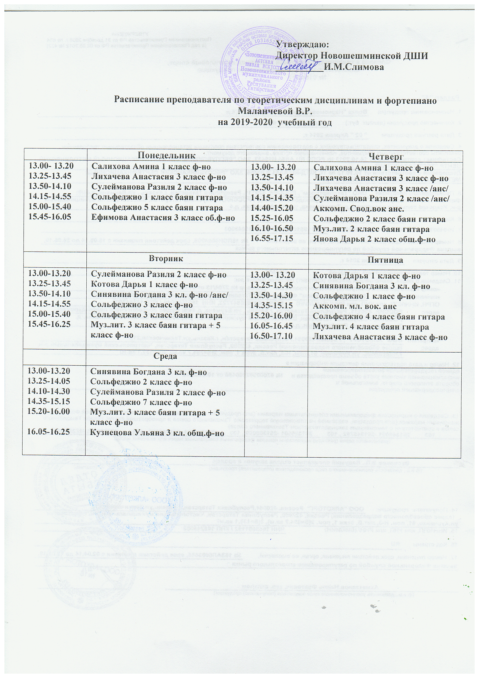 Расписание по классу теоретических дисциплин и фортепиано преподаватель Маланчева В.Р..bmp