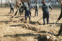 Мәктәп территориясен чистарту эшендә коллектив тырышып эшли .