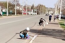 Сотрудники детского сада дружно произвели побелку бордюров и столбов по центральной улице нашего села.