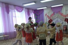 На занятии дети вместе с музыкальным руководителем Шерстобитовой Т.С. готовятся к празднику "8 марта".