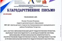 За что и получила благодарственное письмо от «НАУЧНО-ОБРАЗОВАТЕЛЬНОГО ЦЕНТРА ПЕДАГОГИЧЕСКИХ ПРОЕКТОВ»