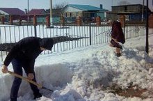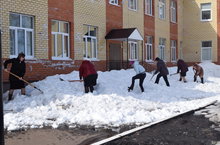 Сегодня в нашей школе прошёл субботник, работники школы раскидывали снег вокруг здания.