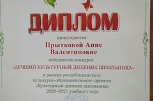 Ученица 4 класса стала победителем в конкурсе "Лучший культурный дневник школьника". Награждена дипломом и ценными подарками.