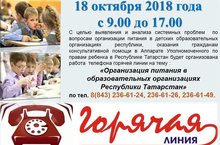 В соответствии с планом работы, с целью выявления и анализа системных проблем по вопросам организации питания в детских образовательных организациях республики, оказания гражданам консультативной помощи 18 октября 2018 года с 9.00 до 17.00 в Аппарате Уполномоченного по правам ребенка в Республике Татарстан будет организована работа телефона горячей линии на тему «Организация питания в образовательных организациях Республики Татарстан» по телефонам 8(843) 236-61-24, 236-61-26, 236-61-49.