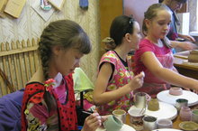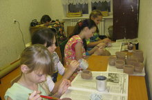 В школе продолжает работу кружок "Гончарное дело". Дети работают на круге, раскрашивают готовые изделия