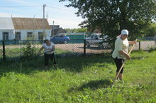 Персонал школы обкашивает территории школы и села.