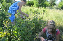 Учащиеся и персонал школы собирают урожай черной смородины.