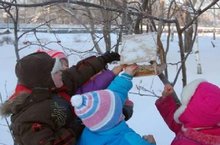 Дети приготовили кормушки, которые они сами изготовили и развесили их на деревьях, чтобы птицам не было голодно и холодно зимой.