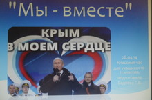 В понедельник 28.04.14 в Екатерининской СОШ проведен парламентский урок -2014 по теме "Мы вместе" на котором учитель Бадяева Т.В. рассказала учащимся о присоединении Крыма к России и их историческом значении, рассказ сопровождался показом презентации. -
