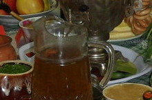 - щи из квашеной капусты, пельмени, окрошка, каша гороховая, каша пшенная, картофель с мясом, тушеный в горшочках; тыква парена, пироги с маком, пироги с капустой, ватрушки, блины, курник, квашеная капуста, мед, варенье малиновое, варенье смородиновое, компот, квас, яблоки свежие и др.