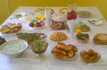С народными песнями и в костюмах встретили гостей в Чув.Чебоксарской ООШ. Чувашская кухня насчитывает не одну сотню лет. Развиваясь, она, естественно, испытывала на себе влияние кулинарных традиций соседей: русских, татар, удмуртов, марийцев. Однако кулинарные заимствования не лишили чувашскую кухню национального колорита, а лишь способствовали ее разнообразию. Для учеников приготовили суп с клецками, блины со сметаной, большой пирог с мясом и картошкой (на чувашском языке -хупла).Также испекли пироги с капустой, с ягодой (кукаль),яйцом. В Екатерининской ООШ был день русской кухни, посвящённый Пасхе. Дети в национальных костюмах рассказывали об особенностях этого праздника: видах блюд и историях их появления.Был широкий ассортимент приготовленных блюд: пироги, домашняя колбаса, холодец, пасха и т.д. Школьное меню также состояла из блюд национальной кухни.
