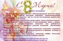 8 Марта - это первый весенний праздник, символизирующий надежду, любовь и красоту - всё то, что вы так искренне дарите нам на протяжении всей жизни.