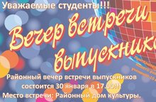 Районный вечер встречи выпускников состоится 30 января в 17.00!!! Приглашаем на вечер студентов и учащихся 10-11 классов!!! Место встречи РДК!