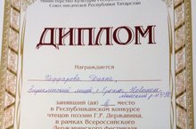 Республиканский конкурс чтецов поэзии Г.Р.Державина 05.11.2019 1 ноября 2019 года Министерство культуры Республики Татарстан совместно с Союзом писателей Республики Татарстан проводил Республиканский конкурс чтецов поэзии Г.Р.Державина, направленный на популяризацию литературного наследия Г.Р.Державина, развитие интересов молодежи и подростков к чтению, поэтическому искусству и творчеству. Учащиеся Зиреклинского лицея Салимова Алина, Гаффарова Диана прошли на очный этап конкурса и выступили на сцене клуба им. Г. Тукая Союза писателей Республики Татарстан. По итогам конкурса Гаффарова Диана заняла 3 место (учитель Мустфина Гульшат Галяутдиновна). Поздравляем с победой!