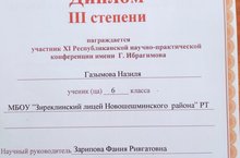 6 нчы сыйныф укучысы Газымова Нәзилә Г.Ибраһимов исемендәге 11 нче республикакүләм фәнни - гамәли конференциядә 3 нче урынга лаек булды.Котлыйбыз.Әфәрин!