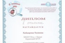 Воспитанница нашего детского сада Хайдарова Тахмина приняла учатие в Республиканском конкурсе исследовательских работ и проектов детей старшего дошкольного возраста «Я познаю мир» в рамках IХ Республиканского конкурса исследовательских работ и проектов школьников «Дебют в науке», которое состоялось в городе Нижнекамск и заняла 2 место.