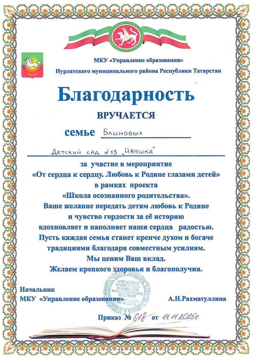Диплом 2 место в конкурсе "Моя семья - самая, самая". Семья Мифтихановых.