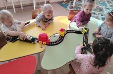 В свой день рождения к ребятам из 1 младшей группы "Б" пришёл самый настоящий паровоз. Ребята узнали о том, что дни рождения бывают не только у людей, но и у техники, транспорта. С новым другом Паровозом дети играли в разные игры, строили из "Бабашек" железную дорогу и катали свои Паровозики, и конечно же не забыли спеть каравай.