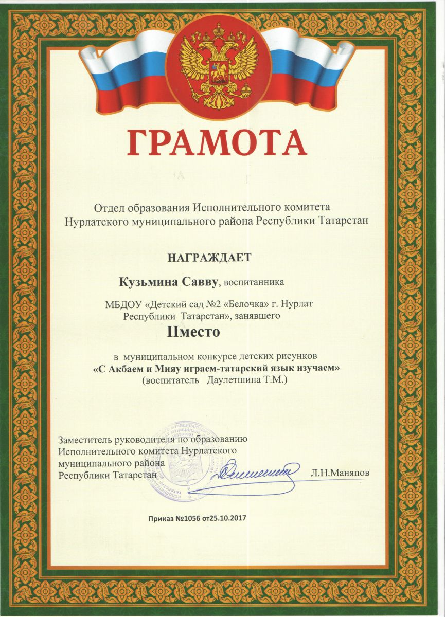 Опубликовано: 23.10.2017В октябре проходил муниципальный конкурс детских рисунков «С Акбаем и Мияу играем – татарский язык изучаем» для детей 6-7 лет. Наш воспитанник Кузьмин Савва занял 2 место среди городских детских садов. Поздравляем! >>>