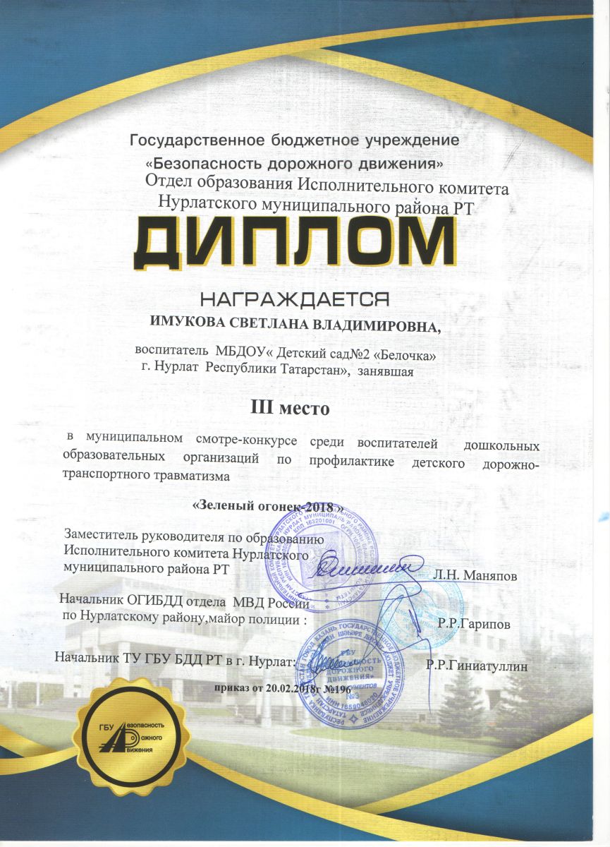 Шәһәр мәктәпкәчә белем бирү оешмалары тәрбиячеләре арасында урта төркем тәрбиячесе Имукова С. В. - 3 урын.