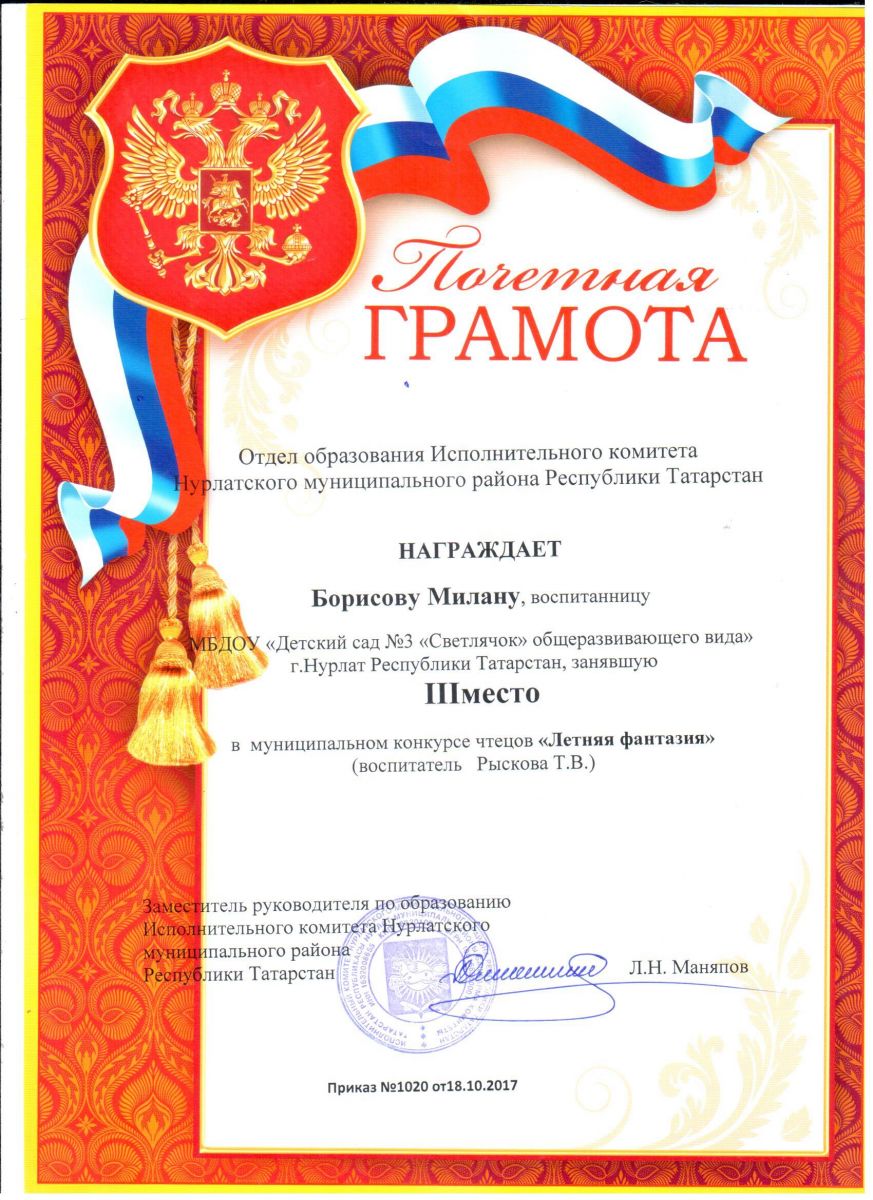 Почётная грамота за III место в муниципальном конкурсе чтецов "Летняя фантазия" Борисова Милана 2017г. / 2017 елның "Җәйге фантазия" муниципаль шигырь укучылар конкурсында Борисова Милана III урын мактау грамотасына лаек булды
