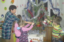 В детском саду началась предновогодняя пора. Самый любимый праздник, как взрослых, так и детей, Новый год. Воспитатели с детьми разучили стихотворения, провели беседы на тему Нового года, новогодних традиций, украсили групповые комнаты, музыкальные руководители разучили песни и танцы, воспитатель по изодеятельности Толкуева Т.Г.оригинально оформила холлы детского сада. Многие любят зиму, потому что это самое красивое время года и потому что зимой такой прекрасный праздник — Новый год. Всё украшено, везде огоньки, дома посреди комнаты вырастает колючее дерево-елка.. Собирается вся семья, говорят красивые слова и дарят замечательные подарки. Люди в Новый год становятся добрее и счастливее. В волшебную ночь у сверкающих огнями ёлок все веселятся и загадывают желания. Бой курантов. И вот настаёт Новый год!