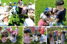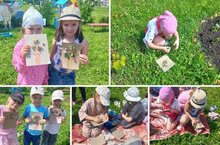 На прогулке ребята группы "Фиксики" превратили обычный картон в настоящее произведение искусства! Они создали удивительную композицию, вставляя яркие цветы, собранные на участке, в специально вырезанные отверстия.