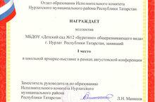 Диплом Отдела образования Исполнительного комитета Нурлатского муниципального района Республики Татарстан коллективу МБДОУ "Детский сад № 12 "Буратино" за I место в школьной ярмарке-выставке в рамках августовской конференции