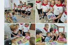 Безнең әзерлек төркемнәре һава пластилиныннан ачык муенсалар ясады һәм аларны 2 нче кече төркем балаларына бүләк итте. Өлкән балалар остазлар булып чыктылар: балаларны муенсалар җыярга һәм бергә уйнарга өйрәттеләр.