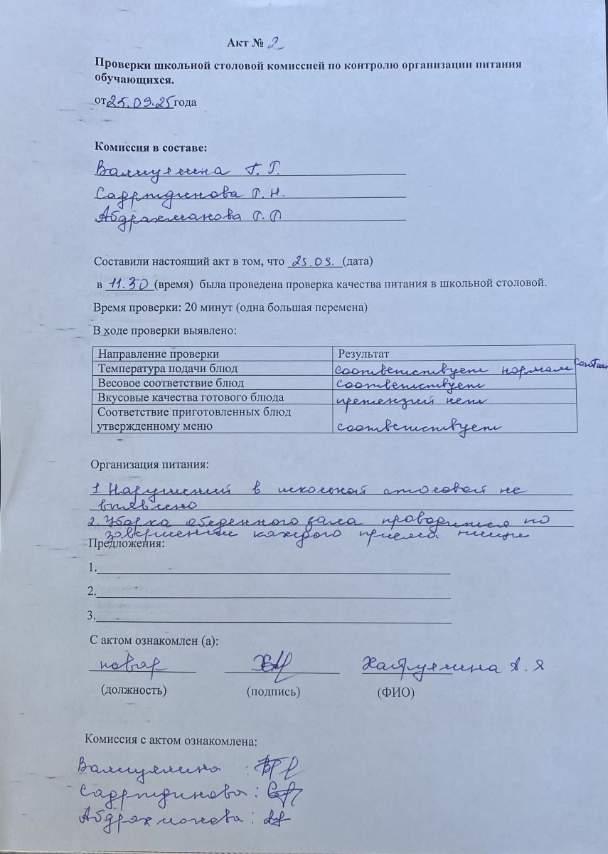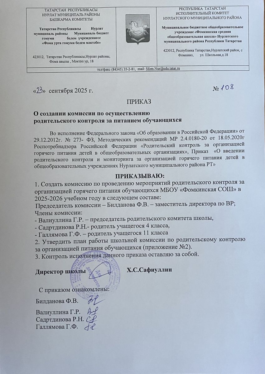 Приказ о создании комиссии по кантолю качества питания в 2025-2026 учебном году