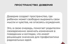 В условиях, когда радикальные идеи могут легко проникать в умы подростков, доверительный диалог становится ключевым элементом, позволяющим обсуждать сложные темы, выявлять тревожные изменения в поведении и противостоять возможному влиянию экстремистских взглядов.